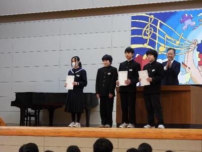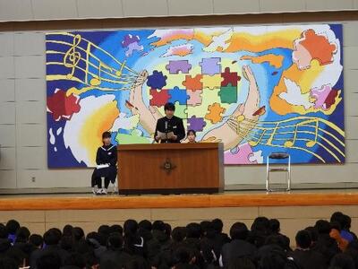 12月24日(水)、今日は81日間の2学期の終業式。終業式に先立って多読賞の表彰式にて、クラス賞と個人賞の表彰を行いました。そして、終業式。各学年代表者から「2学期を振り返って」発表がありました。1年生の代表者からは「体育祭、文化祭と定期テストへの向かい方」について成長を感じたこと、2年生の代表者からは「仲間の大切さ、責任と自覚」をもとに前に踏み出そうとする決意を、3年生の二代表者からは「最後の二大行事での学び、受験に向けた取り組み」など3年生全員が同じ思いで頑張っていこうとする決意を語ってくれました。どの学年もとても充実したものになり、3学期に向けた意気込みを感じました。3学期の始業式は1月8日(木)です。目標をしっかり持って新しい年をスタートしましょう。