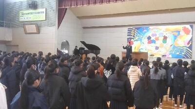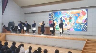 1月8日(木)3学期始業式が行われました。式の前に、表彰報告がありました。今回は人権作文、読書感想文コンクール、村山地区アンサンブルコンテスト(打楽器三重奏は県大会出場)の報告がありました。文化面での活躍も光ります。始業式では、校長から各学年に向けてそれぞれの立場で今年1年頑張ってほしいことについての講話がありました。その後、各学年代表から3学期を迎えるにあたっての抱負が述べられ、1年生代表からは「学習と責任」について、2年生代表からは「互いに高めあう集団になること」について、3年生からは「最高学年としての有終の美と高校受験に向けた決意」について語られました。生徒の皆さんの真剣なまなざしで聞き入っている姿に「これからの生活を共に頑張ろう」とする雰囲気が伝わってきました。まとめの学期スタートです!